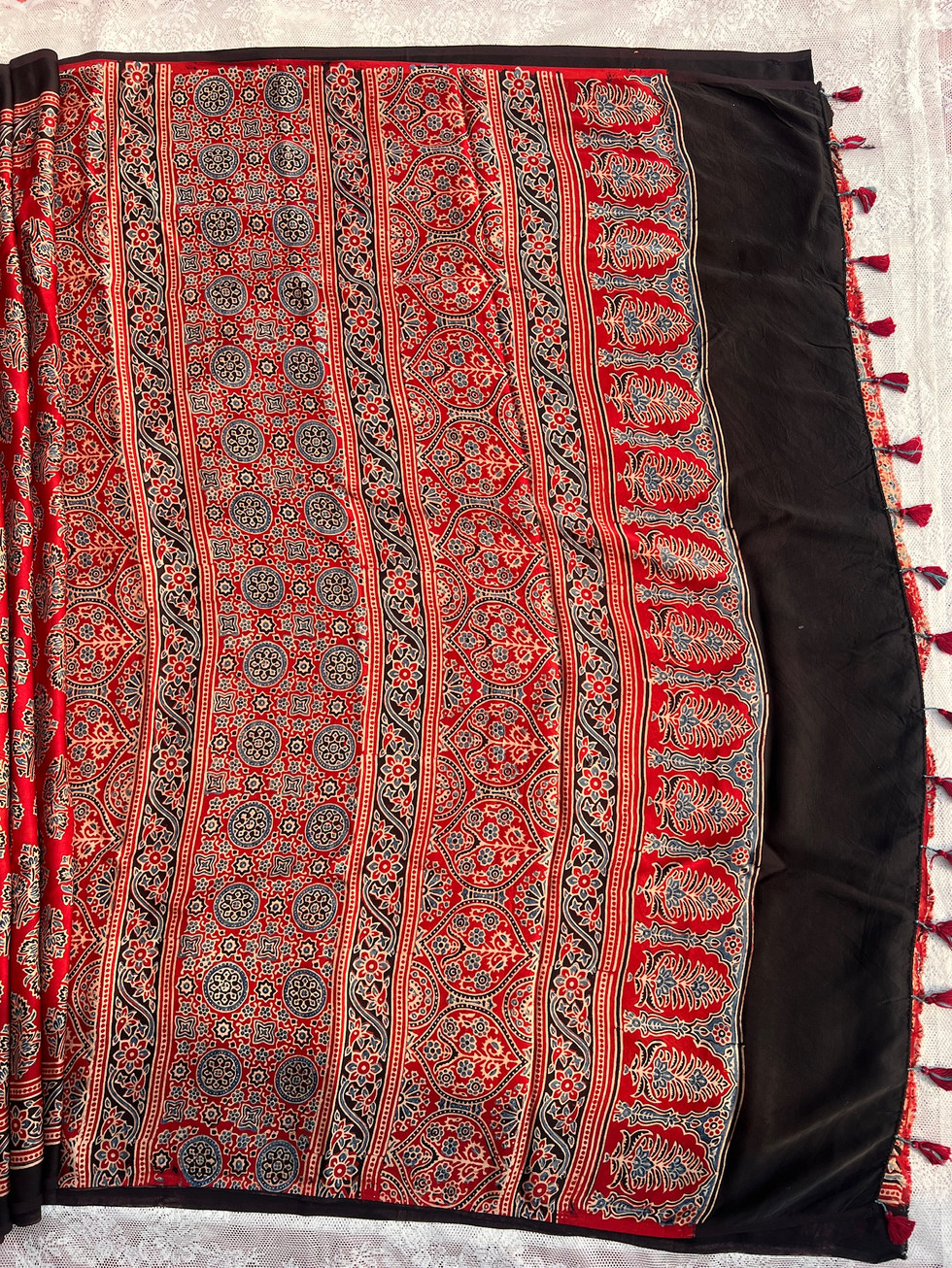 Crimson Blossoms Hand block - Ajrakh Modal Saree