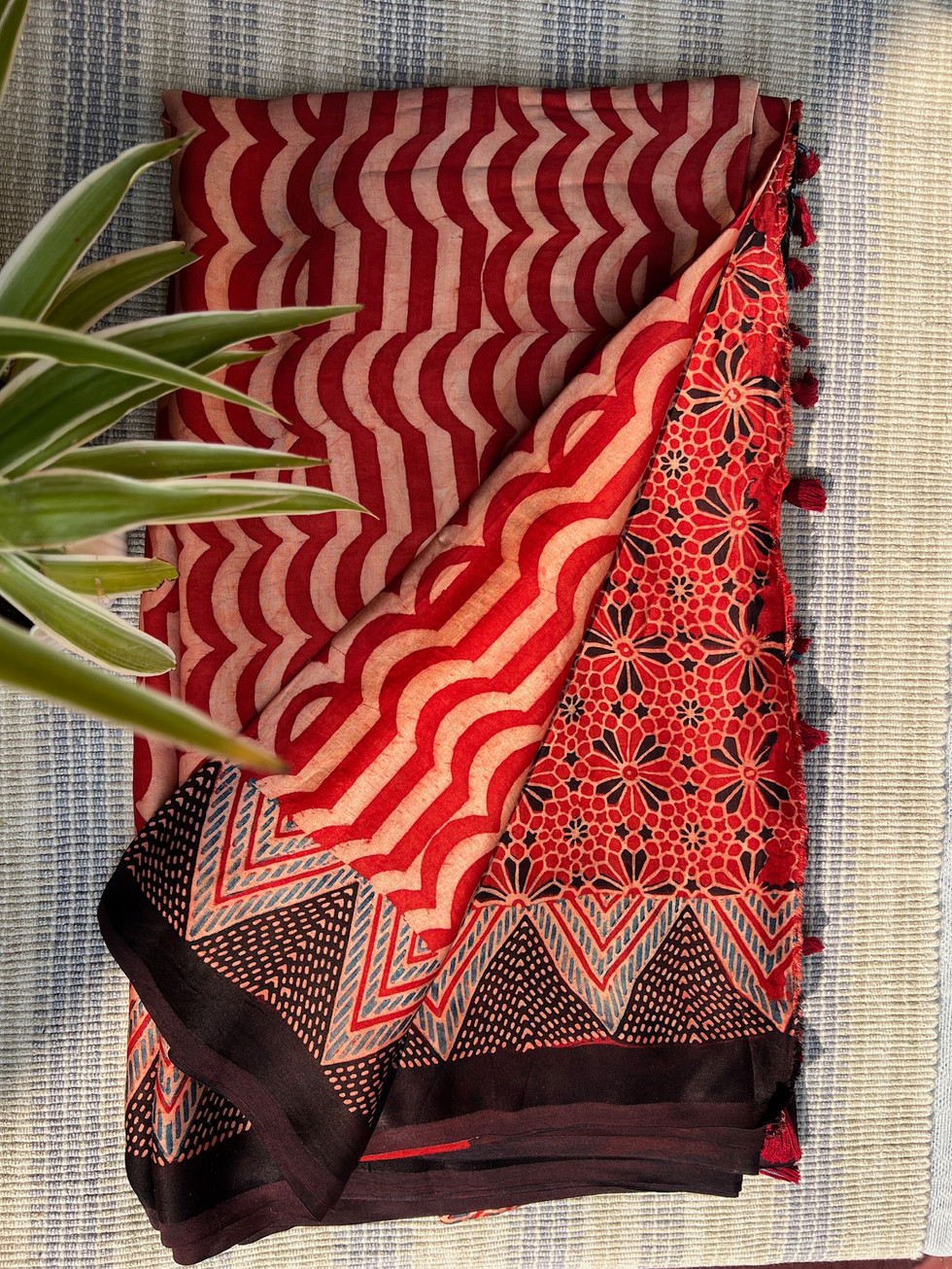 Crimson Ripple Hand Block - Ajrakh Modal Silk Saree with Tassels